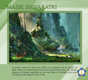 “No solo tenemos el “Mahashivaratri” una vez al año, sino que también tenemos un “Shivaratri” cada mes dedicado a la adoración de Shiva. ¿Y por qué es tan importante este “ratri” (noche)? La noche está dominada por la Luna. La Luna tiene 16 “kalas” (fracciones de la gloria divina); y cada día, o más bien cada noche, durante la quincena oscura, se reduce una fracción, hasta que toda la Luna es aniquilada en la noche de la Luna Nueva. A partir de entonces, cada noche se agrega una fracción, hasta que la Luna es un círculo completo en la noche de la Luna Llena. La Luna es la deidad que preside la mente; la mente crece y decrece como la Luna. “Chandrama manaso jatha”: De la mente del “Purusha” (Ser Supremo), nació la Luna. Debe recordarse que el objetivo principal de todo “sadhana” es eliminar la mente y convertirse en “Amanaska”. Solo entonces “maya” (ilusión) puede ser removida y la realidad revelada”. Sri Sathya Sai Baba – Discurso Divino del “Mahashivaratri” de febrero de 1969.